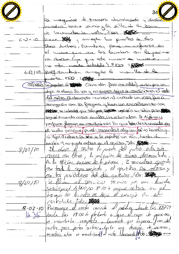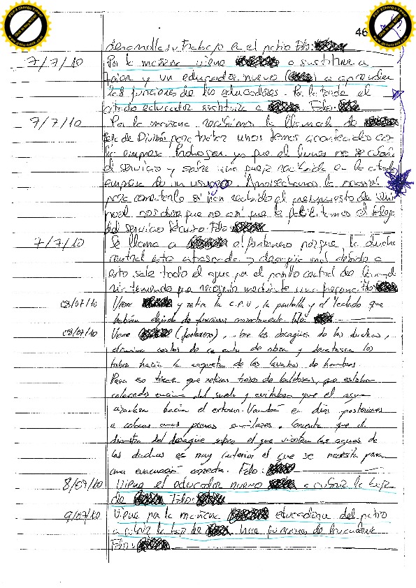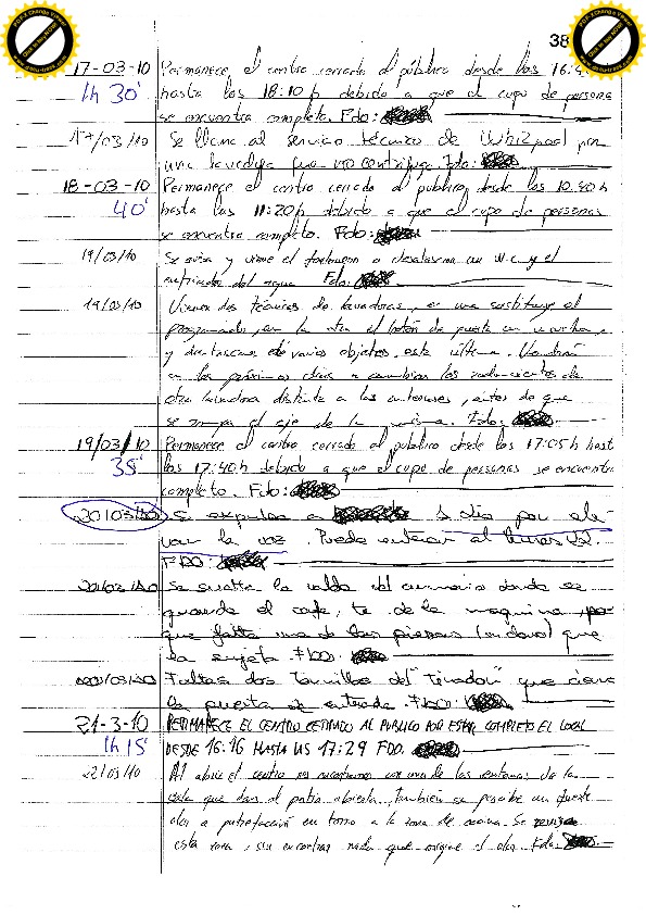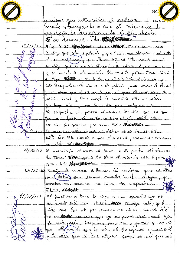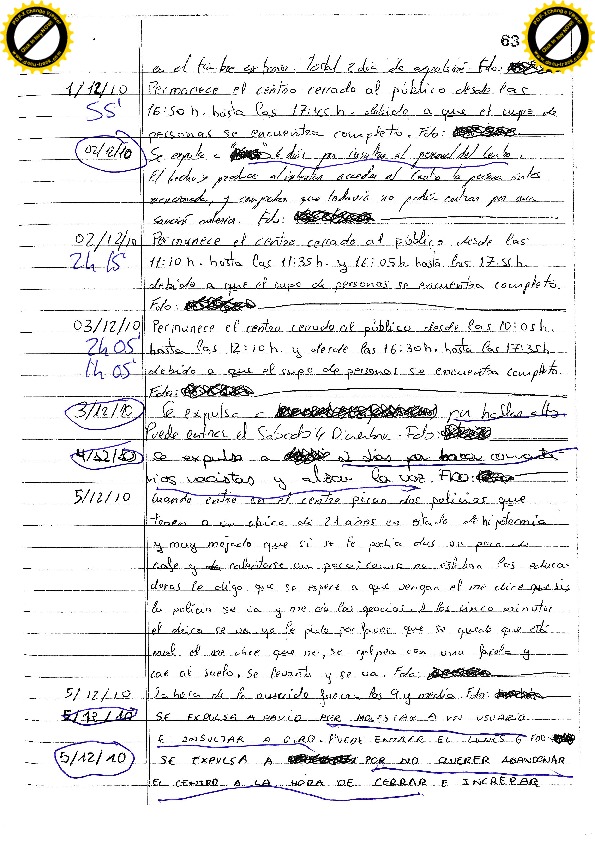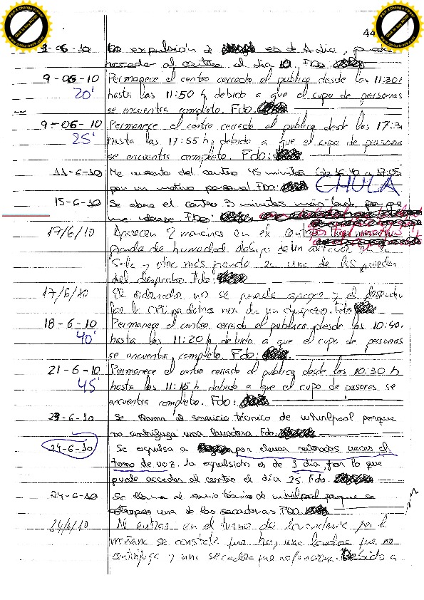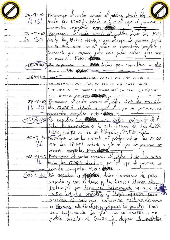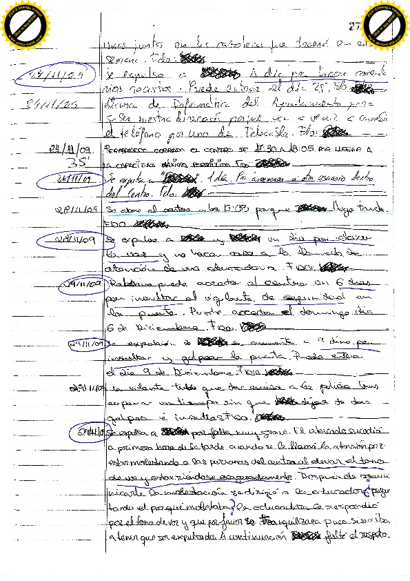 22/11/10 Un expulsado necesita lavar ropa y pregunta al vigilante si el martes puede lavar, el vigilante le comunica que hasta el sábado (por tanto el lunes), no puede entrar. Insulta a los educadores y amenaza al vigilante. La educadora que descubre la anotación del vigilante le sanciona siete días