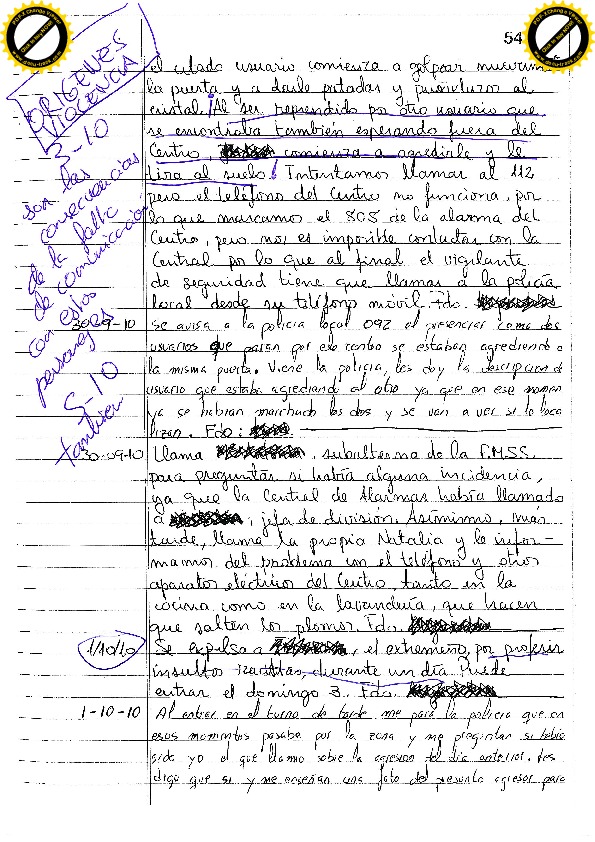 03/10/10 Un usuario expulsado acude al centro, le impiden el paso, empezando a tocar el timbre y a dar puñetazos a la puerta. Acude la Policía y lo detiene
