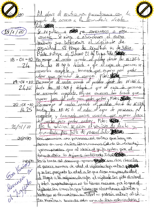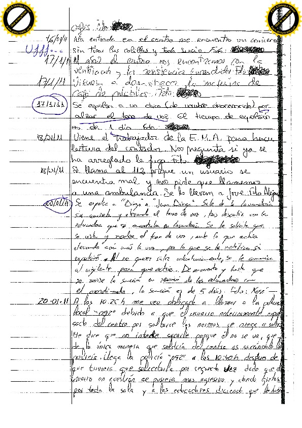25/01/11 Un mes. Expulsado por agarrar jugando a otro usuario por el cuello, mientras el educador llamaba la atención a otro usuario por circunstancias similares. El usuario se reitera en su comportamiento siendo expulsado. Insulta al educador con “maricas” e “hijos de puta”. Escupe al educador y lo amenaza.