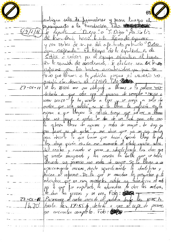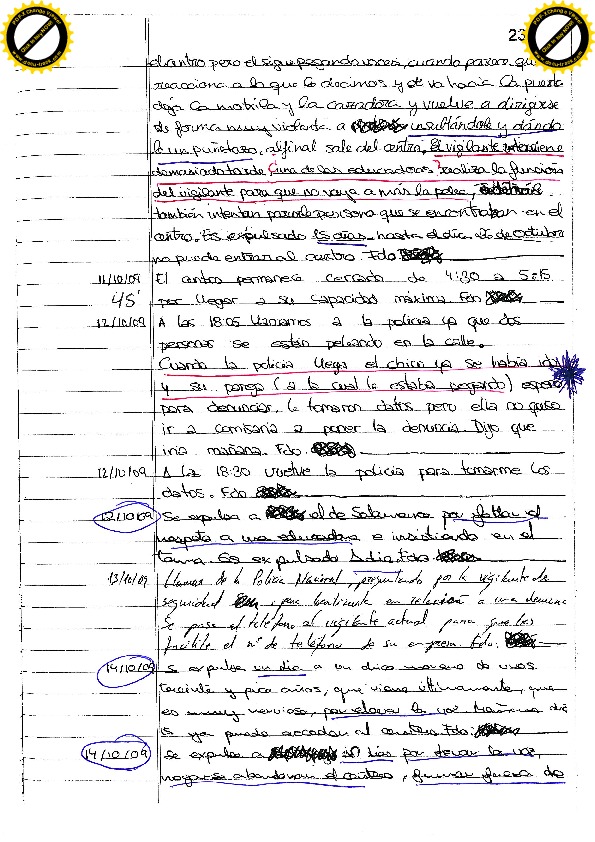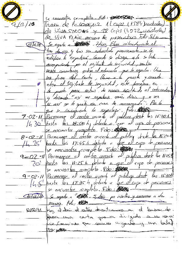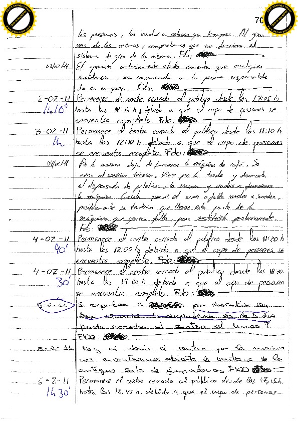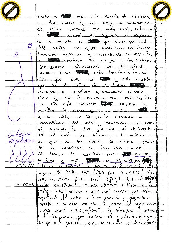 7/02/11 Siete días por elevar la voz. Cuando es expulsado realiza comentarios sobre el educador. En la puerta forcejea con el vigilante para entrar de nuevo e insulta al educador