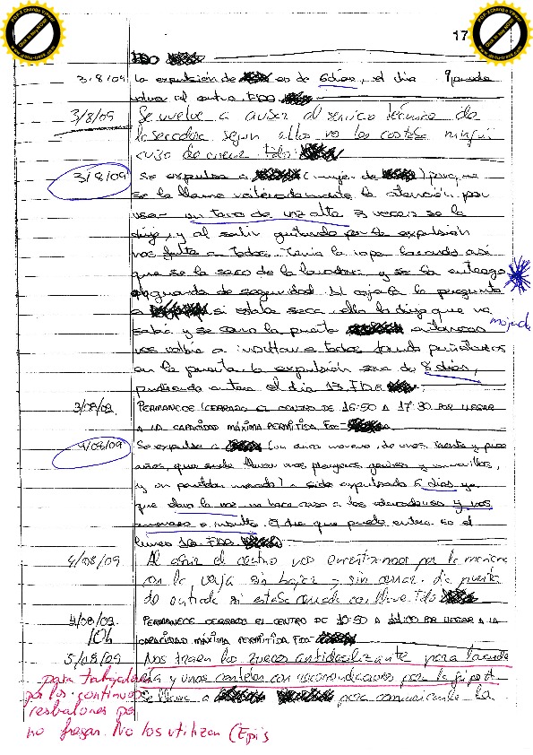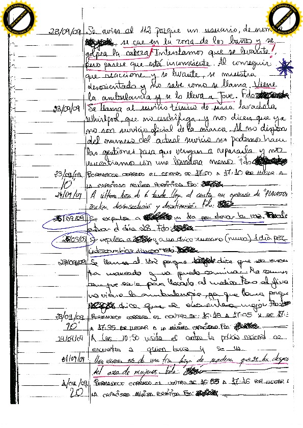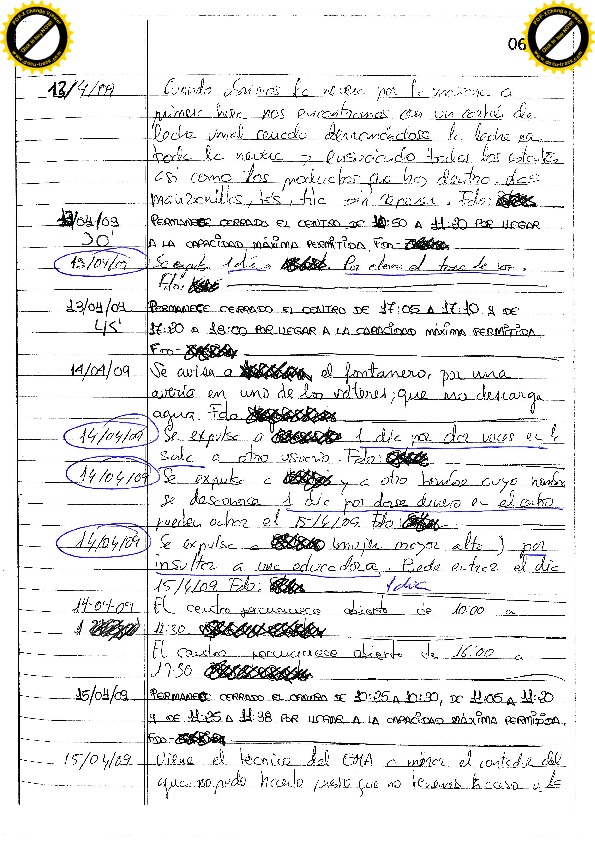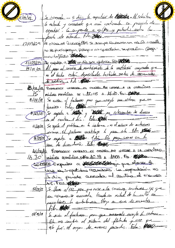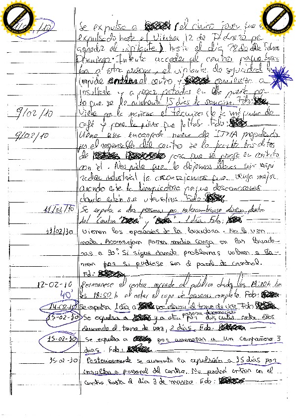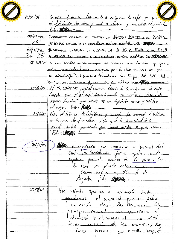13/08/09 Seis días por insultos y amenazas: “estoy hasta los cojones de ti, del centro y que nos va a dar una ostia a todos” y “cago en tu chocho, te voy a dar de ostias, estoy hasta los cojones de que salga siempre agua fría”. En referencia a las duchas. Todo ello después de salir de la ducha